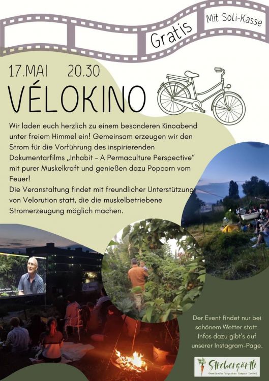 Im Strebergärtli, dem Gemeinschaftsgarten beim Campus Irchel (Karte), findet am Samstagabend ein VéloKino statt. Gezeigt wird der Dokumentarfilm "Inhabit – A Permaculture Perspective", dazu gibt es Popcorn vom Feuer.