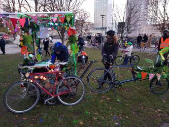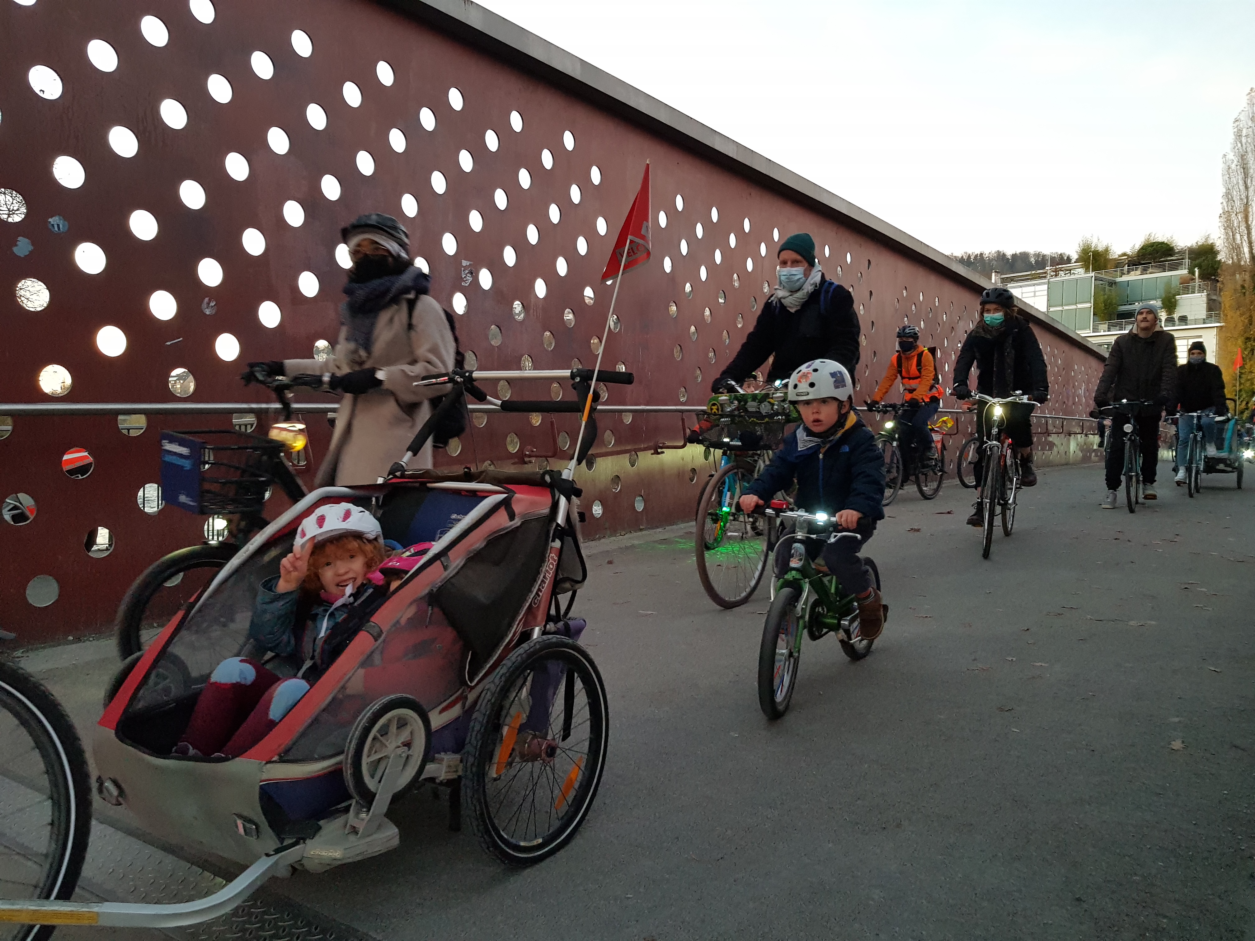 Nun ist die Startansage vorbei und es geht los, zuerst über die Limmat Richtung Turbinenplatz. Auffallend viele Menschen haben ihre Gefährte dekoriert: mit Lichterketten, Blumen, Schildern. Auch die ganz kleinen sind tapfer mit Laufrädern und dreirädrigen Trottinetts dabei.