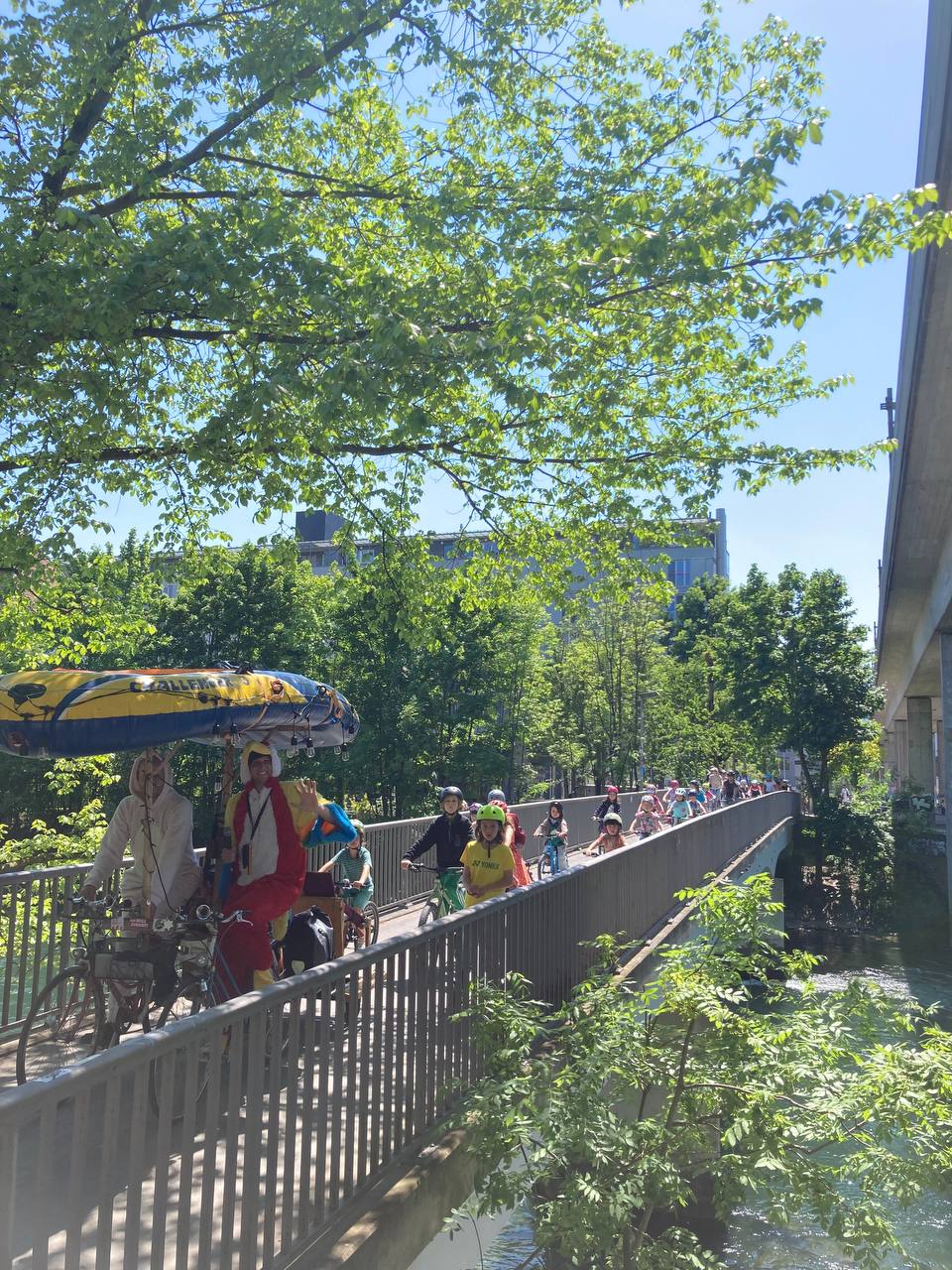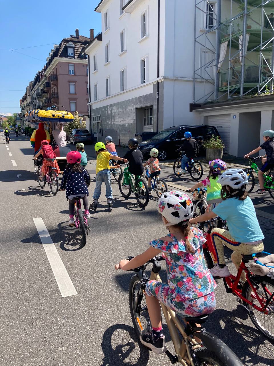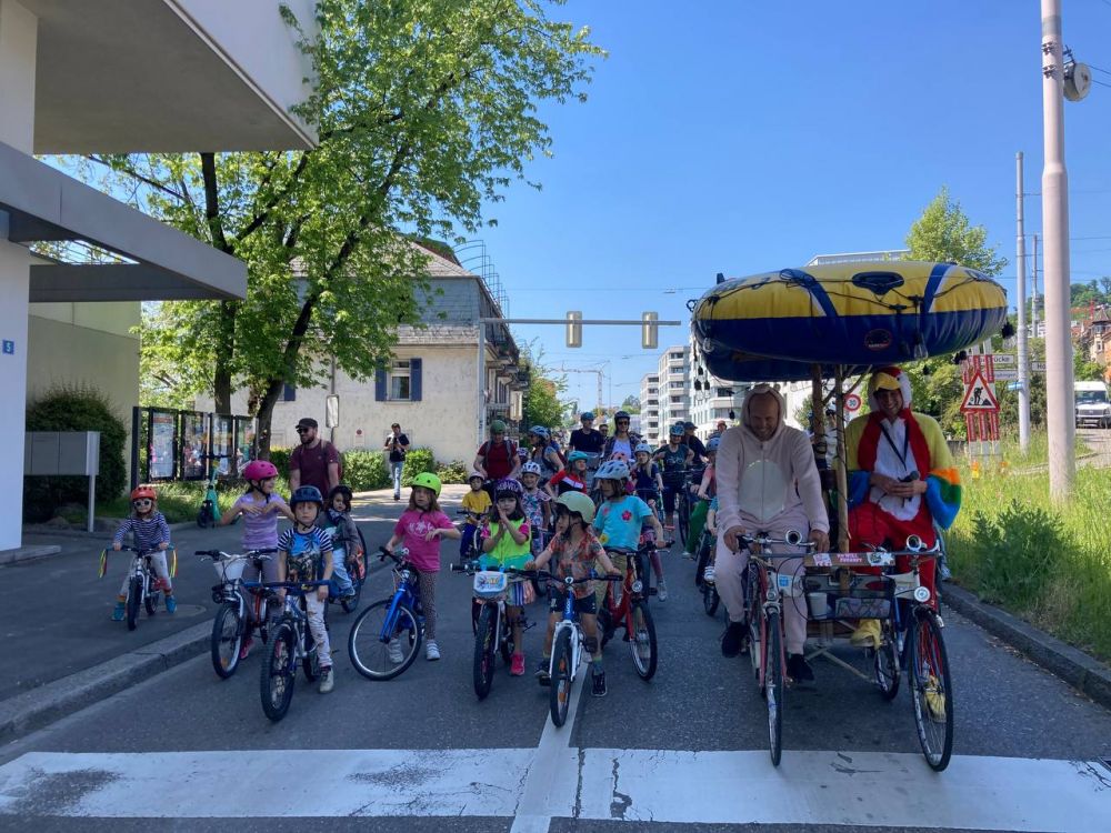 Vorausgerollt ist immer das Velo-Gummiboot mit dem Papagei und dem Einhorn und viel Musik. Wir waren so viele Menschen, dass hinten die Musik leider gar nicht mehr zu hören war. Wir waren nämlich 290 Menschen am Umzug! Ausserdem speziell schön war diesmal die Polizei: Statt mit Auto und Töffs sind die vier Polizisten mit ihren Elektrovelos dabei gewesen. Das war cool!