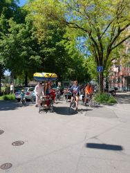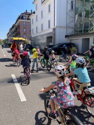 Am vergangenen Samstag, 10. Mai sind wir in Zürich bei bestem Wetter in die Kidical Mass-Saison gestartet. Beim Kiosk Josefwiese konnten wir uns vor dem Start mit Sirup und Popcorn verpflegen. Dann sind wir losgerollt, durchs Industriequartier, entlang der Limmat, mit Ziel Wipki Velofäscht beim Burrischopf.