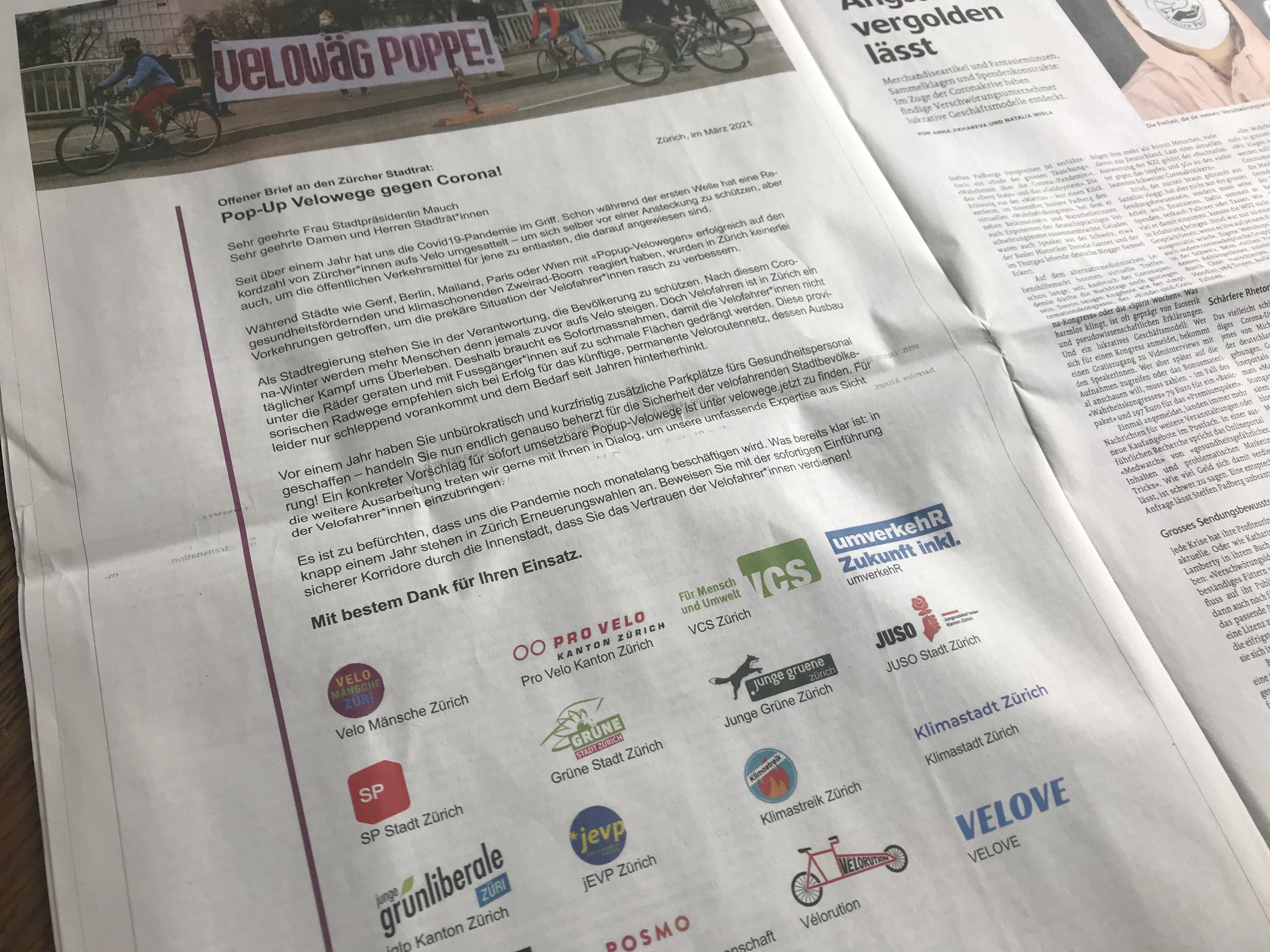 Um den Stadtrat doch noch zum Umdenken zu bewegen, haben Gruppierungen aus der Zürcher Velobewegung – darunter die Vélorution – einen offenen Brief verfasst. Dank einem erfolgreichen Crowdfunding, bei dem 170 Menschen über 12'000 Franken beigesteuert haben – ist dieser nun in verschiedenen Zeitungen erschienen.